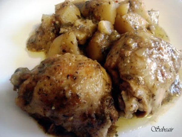 Contramuslos de pollo con patatas al chimichurri (fussioncook) PlatoFácil1 hora Enviar esta receta a un amigo Imprimir esta página Preguntar al autor Publicar la foto de esta receta Ingredientes 4 4 contramuslos de pollo 4 patatas 1 cucharada de café de tomillo 1 cucharada de café de orégano 1 cucharada sopera de especias para preparar chimichurri 1 medida de vino dulce 1 chorrito de salsa de soja 1 pastilla de caldo de carne 4 cucharadas soperas de aceite de oliva Sal y pimienta para el pollo Costo estimado: 8.2Euros€ (2.05€/porción)