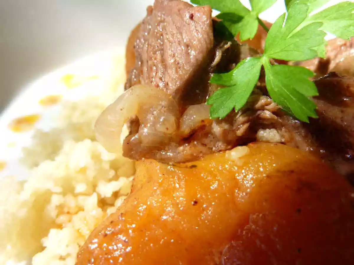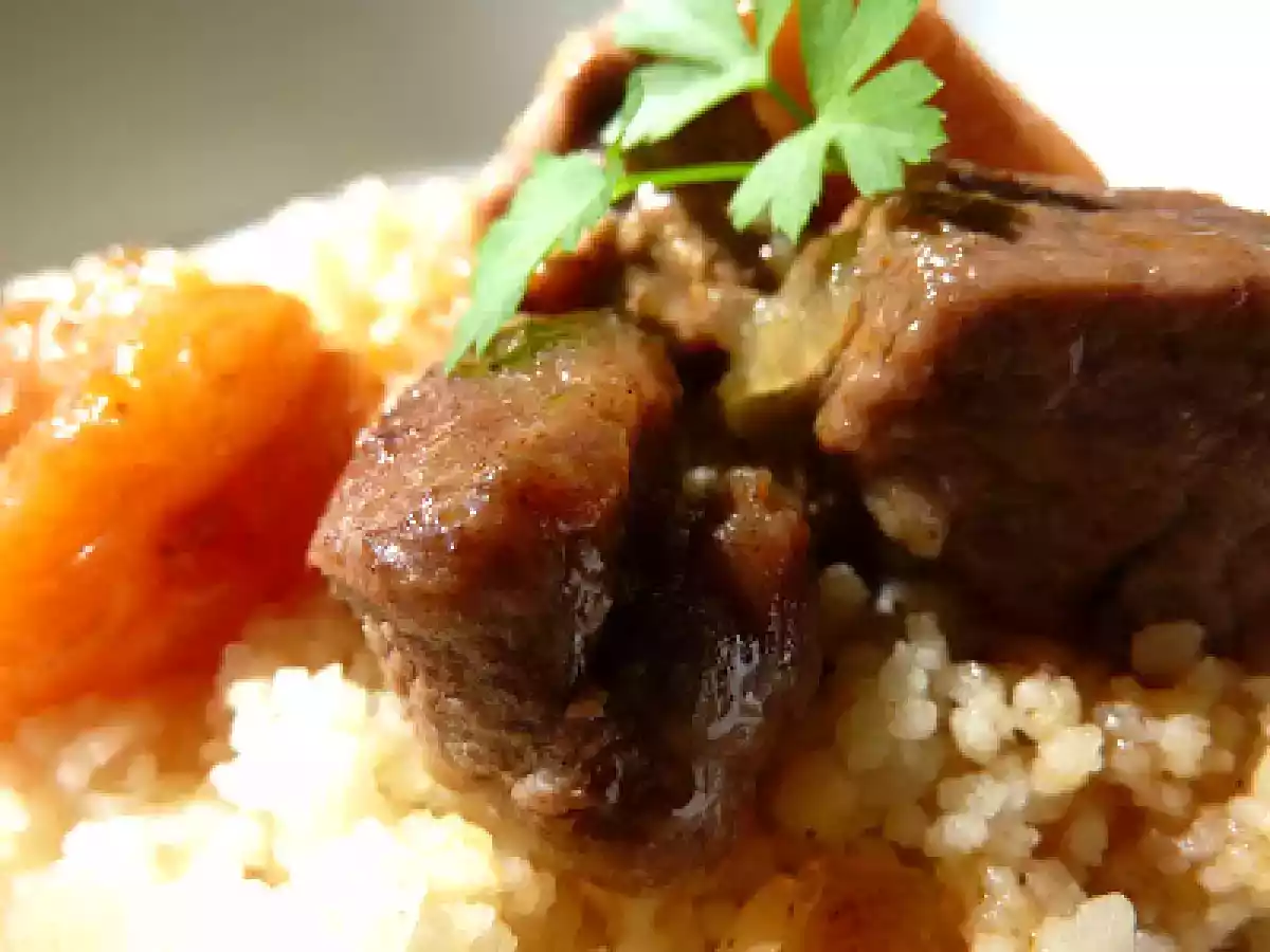 Cordero con miel, albaricoques.... y una coincidencia!. AnteriorSiguiente PlatoFácil30 min741 Kcal Enviar esta receta a un amigo Imprimir esta página Preguntar al autor Publicar la foto de esta receta Ingredientes 4 1 kg de pierna de cordero deshuesada y troceada en tacos de tamaño "bocado". 40 g de mantequilla. 1 cucharadita de canela molida. 1 cucharadita de jengibre molido. Pimienta negra recien molida. 1 pizca de pimienta de cayena. 1 cebolla cortada en rodajas. 500 ml de caldo de pollo o verduras. 1 manojito de cilantro atado con un hilo de algodón, como si fuese un "bouquet garni". 250 g de orejones, o si es la temporada, 500 gr de albaricoques limpios y sin hueso. 4 cucharadas de miel. Almendras fileteadas. 1 taza (250 ml) de sémola de cuscús precocida. 1 taza (250 ml) de agua.