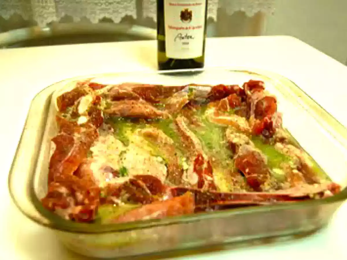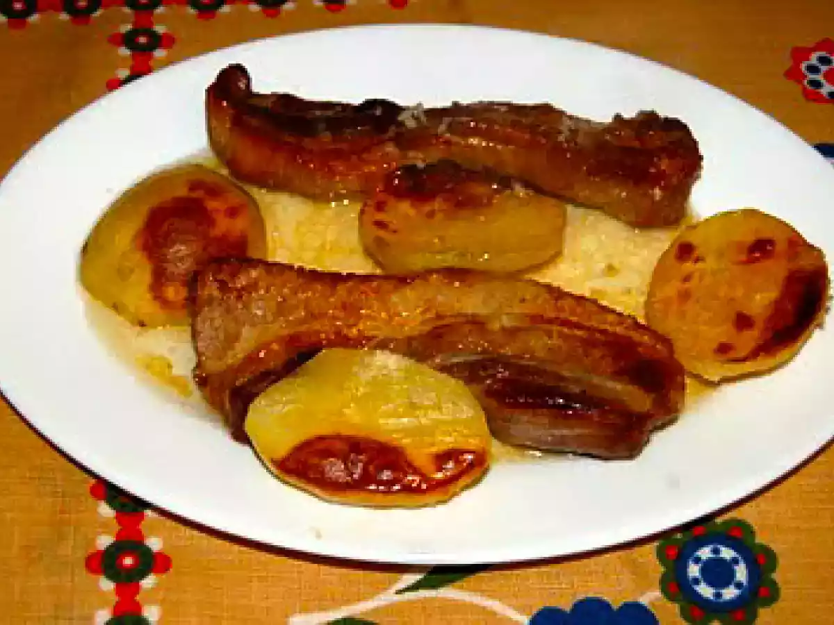 Costilla de cerdo al horno AnteriorSiguiente PlatoFácil30 min187 Kcal Enviar esta receta a un amigo Imprimir esta página Preguntar al autor Publicar la foto de esta receta Ingredientes 4 Costilla carnuda de cerdo Ajos Perejil Sal 1 Pastilla de avecren Pimienta molida Vino blanco 2 Hojas de laurel Patatas (opcional) Costo estimado: 2.83Euros€ (0.71€/porción)