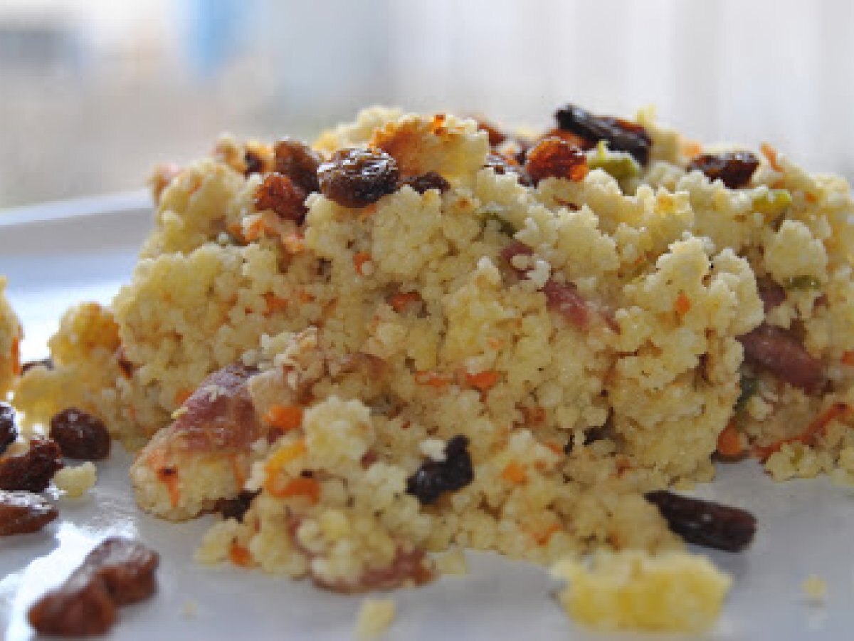 Cous cous con jamón vota ahora PlatoFácil20 min Enviar esta receta a un amigo Imprimir esta página Preguntar al autor Publicar la foto de esta receta Ingredientes 2 250 G De Cous Cous mediano 500 Ml. caldo Pollo 1 C.S. De Mantequilla Jamón Salado En Tiras Al Gusto 1 Calabacín 1 Pimiento Verde Italiano 2 Zanahorias Pasas Sal