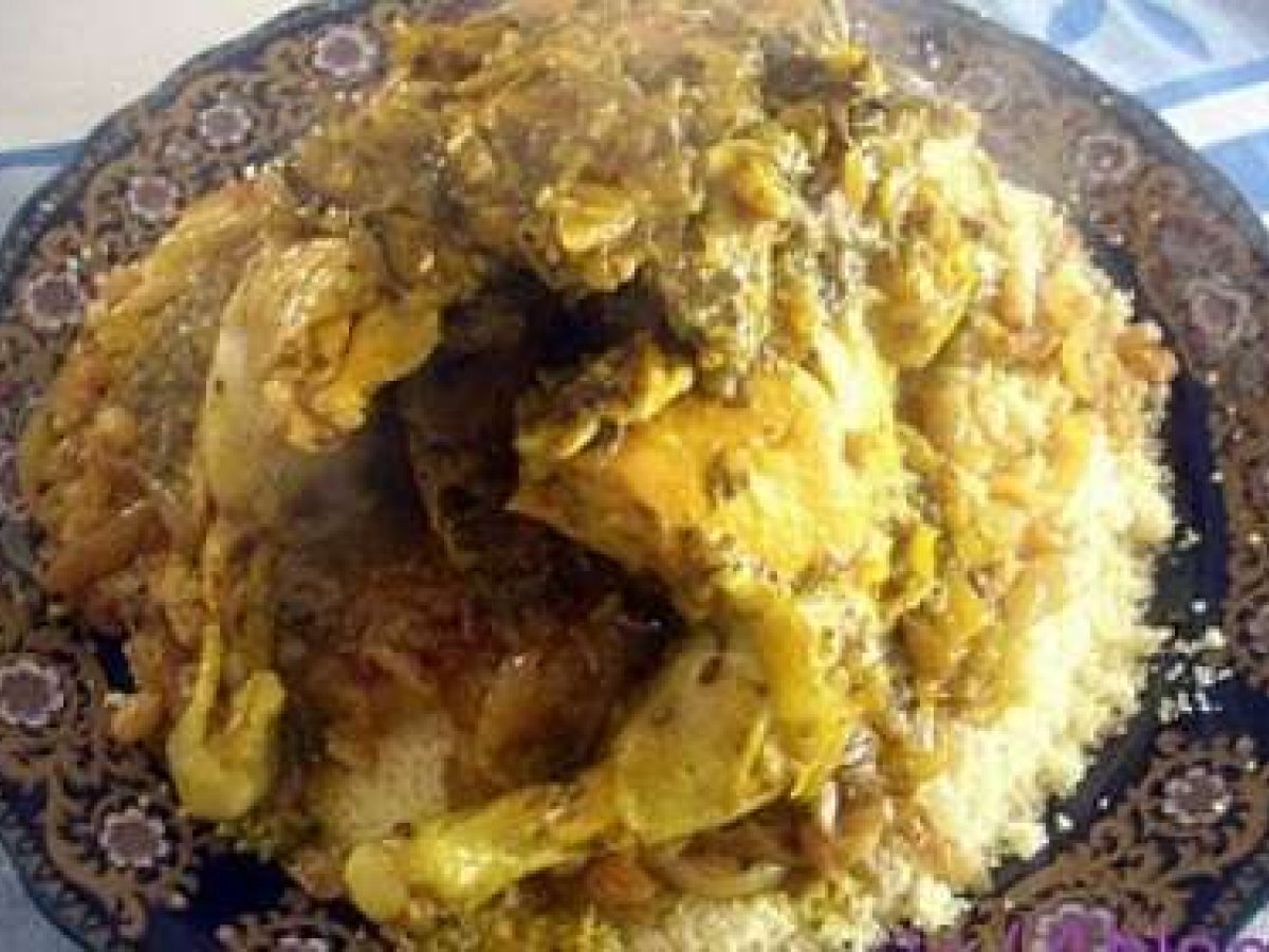 Cous-cous de pollo y cebolla caramelizada AnteriorSiguiente PlatoDifícil10 horas Enviar esta receta a un amigo Imprimir esta página Preguntar al autor Publicar la foto de esta receta Ingredientes 1 1 pollo mediano 6 cebollas perejil 100g uvas pasas (de las blancas) pimienta negra, comino, canela, azafrán, jengibre 2 hojas de laurel mantequilla szmen (mantequilla clarificada) miel agua de azahar 1 paquete de couscus (para unas 6 personas, aproximadamente) agua sal aceite vegetal