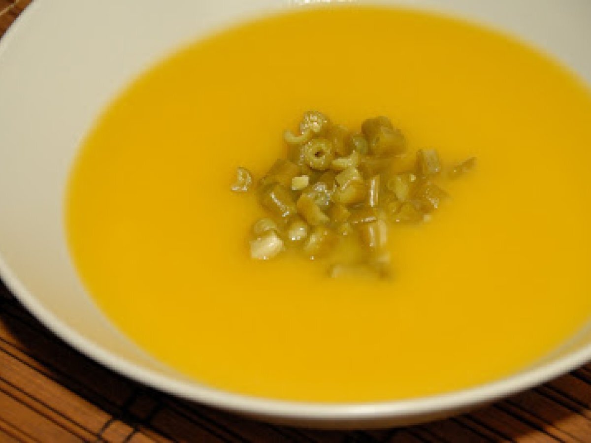 Crema de calabaza ligera PlatoFácil30 min67 Kcal Enviar esta receta a un amigo Imprimir esta página Preguntar al autor Publicar la foto de esta receta Ingredientes 4 Un kg de calabaza. Un puerro. Una cebolla. Dos vasos de agua. Aceite de oliva virgen extra. Sal. Costo estimado: 2.09Euros€ (0.52€/porción)