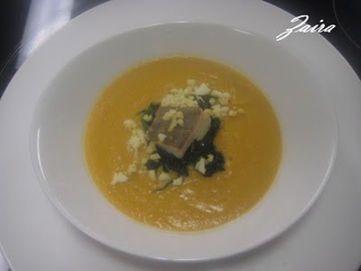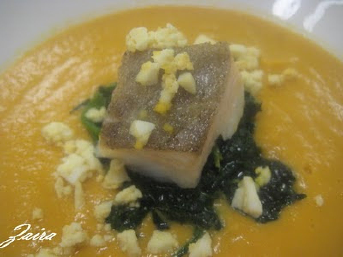 Crema de garbanzos con bacalao y espinacas AnteriorSiguiente PlatoFácil50 min312 Kcal Enviar esta receta a un amigo Imprimir esta página Preguntar al autor Publicar la foto de esta receta Ingredientes 6 400 g de garbanzos cocidos 2 zanahorias 1 puerro 1 cebolla Fumet de pescado o caldo de verduras 300 g de espinacas 12 dados de bacalao en salazón 2 dientes de ajo Una cucharadita de pimentón dulce Un poco de aceite de oliva Sal Costo estimado: 20.4Euros€ (3.4€/porción)