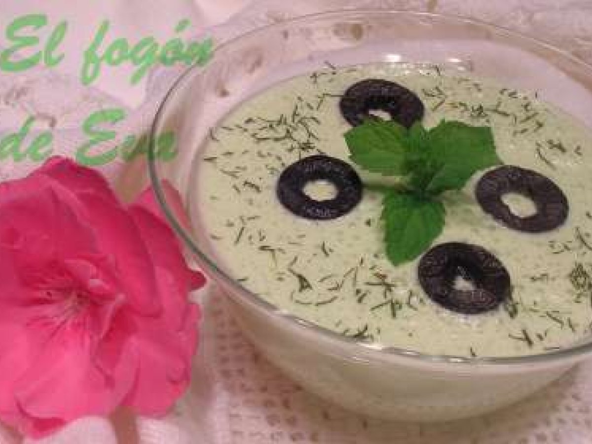 Crema fría de pepino PlatoFácil15 min Enviar esta receta a un amigo Imprimir esta página Preguntar al autor Publicar la foto de esta receta Ingredientes 4 2 pepinos (aproximadamente 300 gr), 4 yogures griegos sin azúcar, 2 dientes de ajo, un trocito de cebolleta, 100 ml de aceite de oliva, limón, sal, eneldo, hojas de menta fresca (reservamos algunas para decorar), agua al gusto y algunas aceitunas negras para decorar.