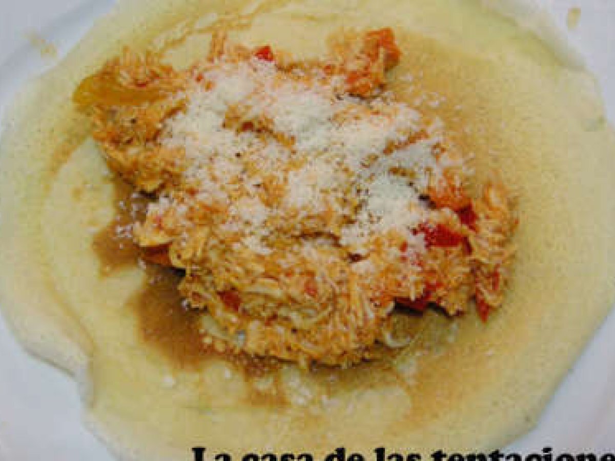 Crepes de pollo AnteriorSiguiente PlatoMedio1 h 15 m Enviar esta receta a un amigo Imprimir esta página Preguntar al autor Publicar la foto de esta receta Ingredientes 2 Para el relleno: 2 pechugas de pollo. 2 zanahorias 1 cebolla pequeña 1 pimiento rojo no muy grande Tranchetes Queso rallado o en polvo Tomate frito (al gusto) Para la masa de los crepes: 125 g de harina 250 g de leche 1 huevo 1 cucharada de aceite de oliva 1 pellizco de sal mantequilla(para engrasar la sartén)