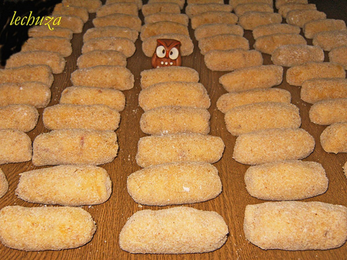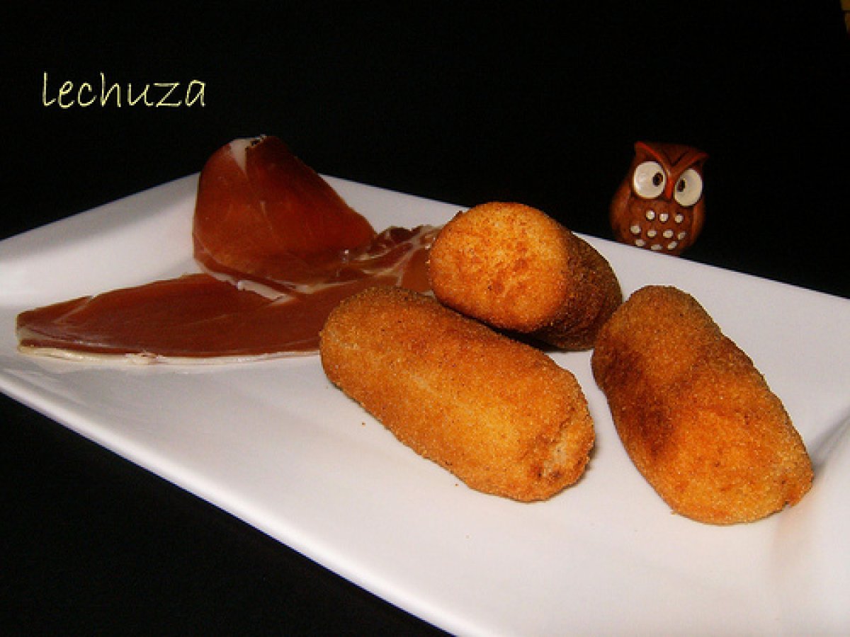 Croquetas de jamón serrano AnteriorSiguiente PlatoFácil30 min Enviar esta receta a un amigo Imprimir esta página Preguntar al autor Publicar la foto de esta receta Ingredientes 2 200 g de jamón en taquitos 1 cebolla mediana 30 g mantequilla 3 cucharadas de aceite oliva 3 cucharadas de harina 1/2 litro de leche (aprox.) para rebozar: harina, huevo y pan rallado