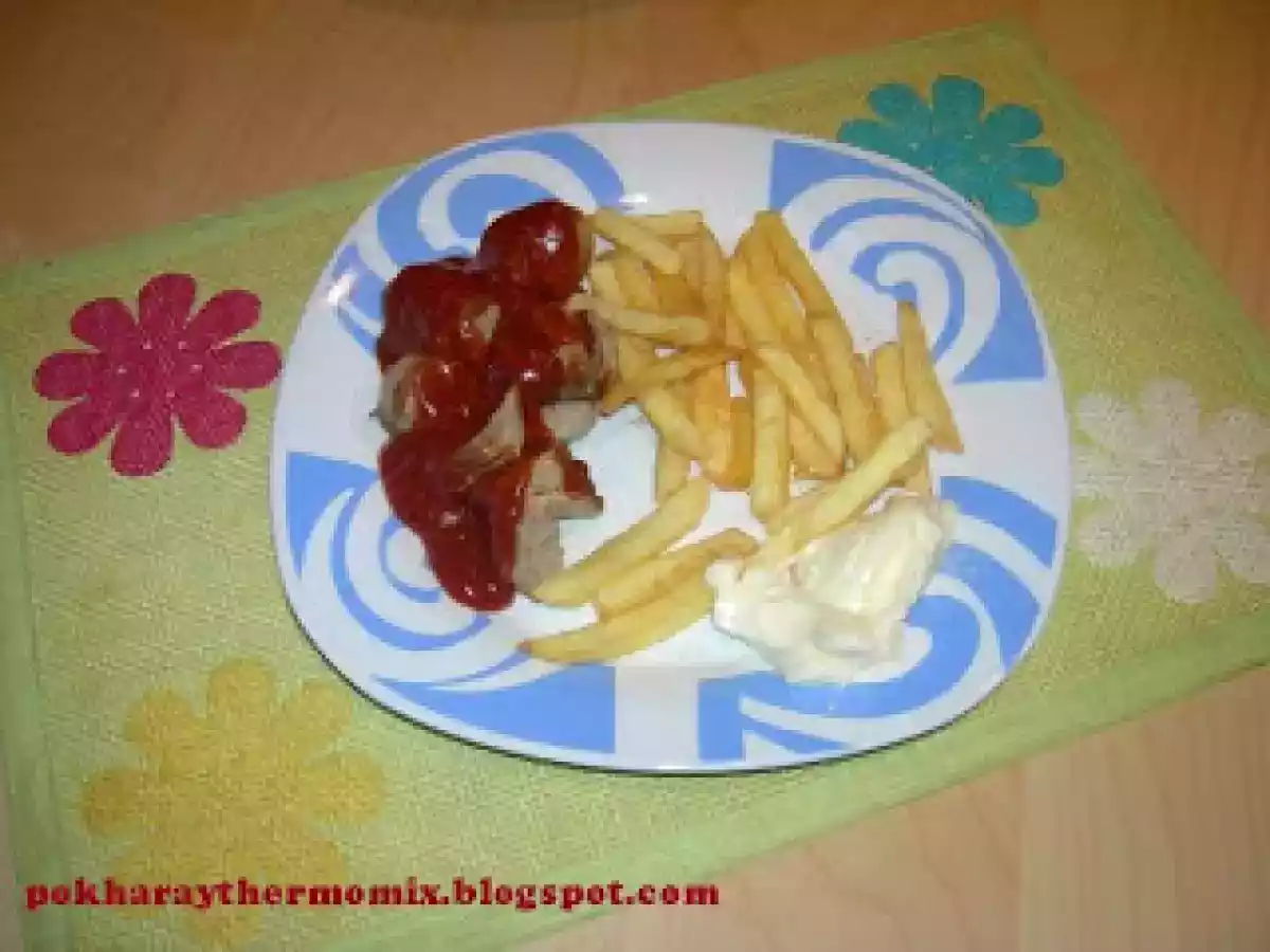 Hacemos unos cortes a las salchichas sin llegar a trocearlas enteras. En una sartén añadimos un poquito de aceite para freír las salchichas. Lo ideal es hacerlas a la parrilla, quedan más ricas. Cuando esten bien doraditas las sacamos de la sartén y emplatamos junto con patatas fritas.
