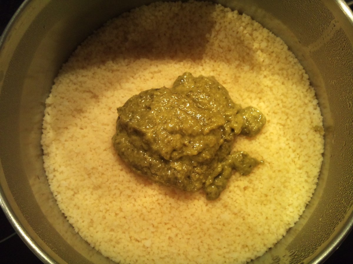 Cuscus al pesto e melanzane - cuscús con pesto y berenjenas AnteriorSiguiente PlatoFácil35 min Enviar esta receta a un amigo Imprimir esta página Preguntar al autor Publicar la foto de esta receta Ingredientes 4 200gr de cuscús 1 berenjena Aceite de girasol 50gr de pesto 2 mozzarellas Hojas de albahaca Aceite extra virgen Sal