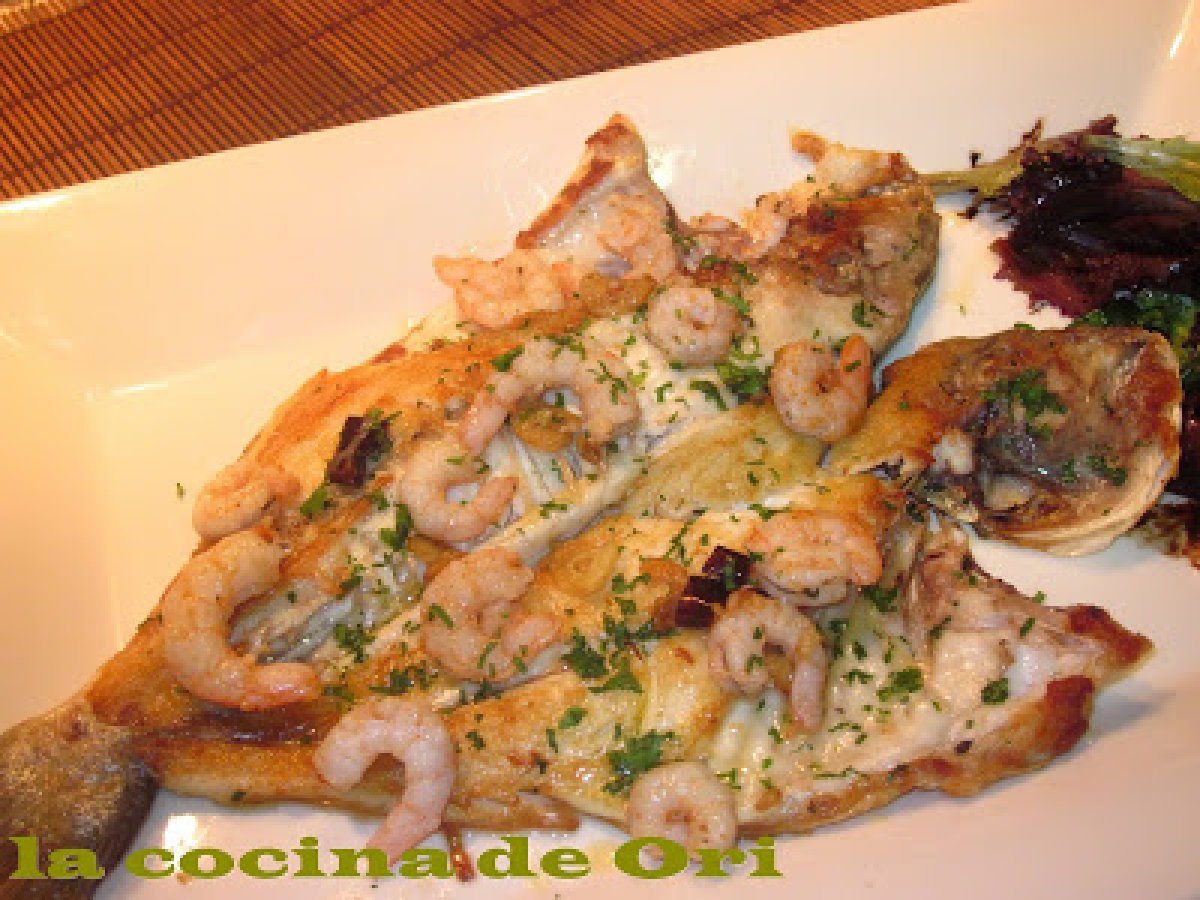 Dorada a la espalda con gambas AnteriorSiguiente PlatoFácil30 min Enviar esta receta a un amigo Imprimir esta página Preguntar al autor Publicar la foto de esta receta Ingredientes 2 4 doradas de entre 400-600 g 4 dientes de ajo en laminas 200 g de gambas 1/2 guindilla en rodajitas aceite de oliva virgen extra perejil picado