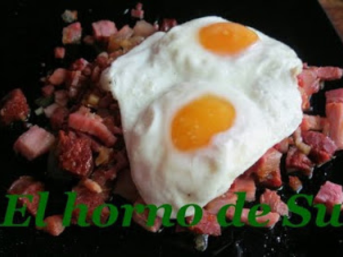 - Lo emplatamos. En otra sartén freímos los huevos y los ponemos sobre la fritura anterior. Servimos.