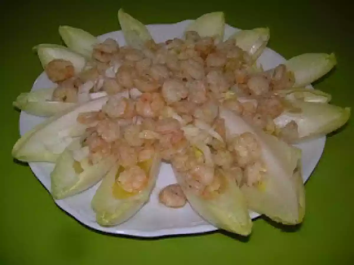 Endibias con gambas PlatoFácil20 min Enviar esta receta a un amigo Imprimir esta página Preguntar al autor Publicar la foto de esta receta Ingredientes 4 4 unids. de endibias 4 unids. de huevos duros 2 unids. de Tomates para aliñar Una lata pequeña de gambas, 100 g de atún en aceite 2 unidades de cebolletas 1 vaso de Salsa mayonesa 2 cucharadas soperas de salsa Worcestershire Crema de leche Pimienta, Sal Costo estimado: 7.49Euros€ (1.87€/porción)
