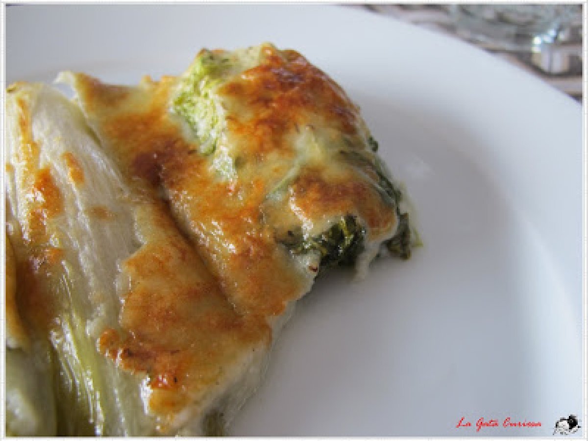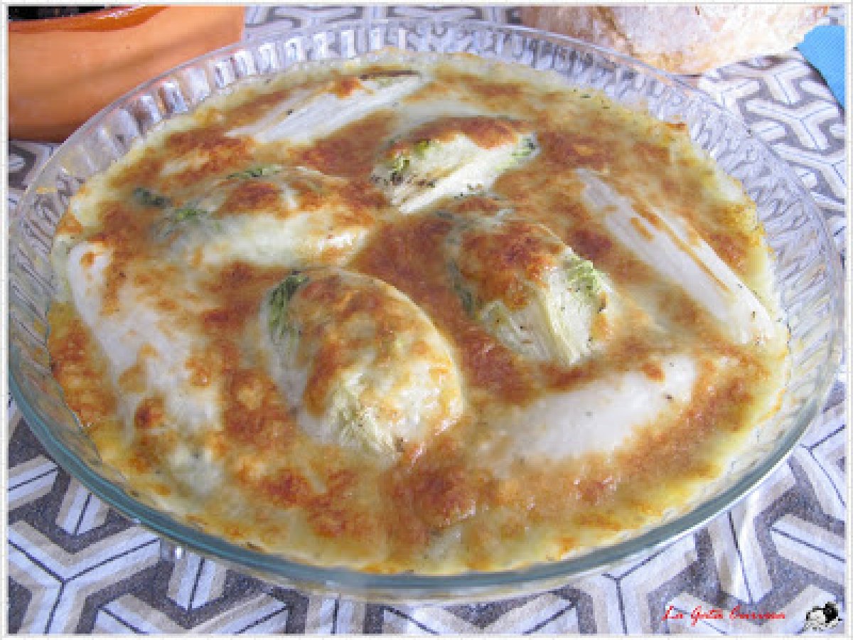 Endivias y lechugas gratinadas AnteriorSiguiente PlatoMedio50 min203 Kcal Enviar esta receta a un amigo Imprimir esta página Preguntar al autor Publicar la foto de esta receta Ingredientes 4 2 endivias, 2 cogollos de lechuga, 150 gramos de queso emmental, 50 gramos de queso azul, sal, pimienta, un chorrito de aceite.
