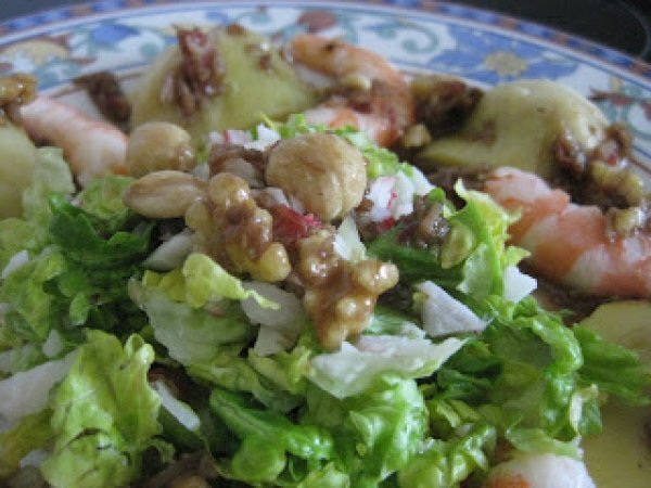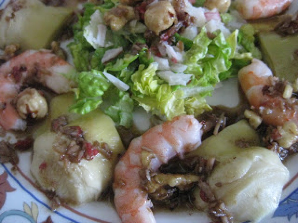 Ensalada de alcachofas y langostinos con vinagreta de frutos secos AnteriorSiguiente PlatoFácil40 min191 Kcal Enviar esta receta a un amigo Imprimir esta página Preguntar al autor Publicar la foto de esta receta Una pequeña ensalada para acompañar a los amantes de la comida. Ingredientes 2 Langostinos cocidos corazones de alcachofas 1 cogollo de lechuga palitos de cangrejo nueces avellanas vinagre de Módena aceite de oliva virgen sal pimienta.