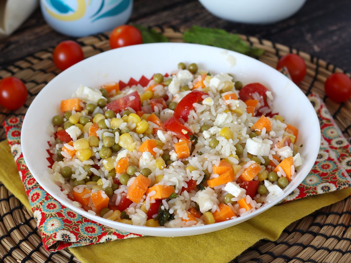 Ensalada de arroz vegetariana: maíz, queso feta, zanahorias, guisantes, tomate y menta