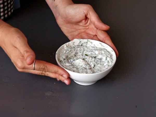 Preparar la salsa: Mezclar el yogur con la chalota bien picada, las hierbas frescas picadas, sal y pimienta.