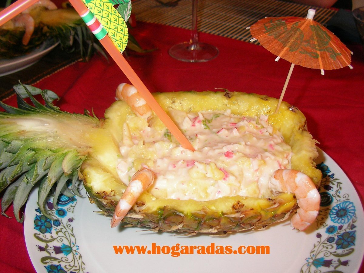 Ensalada tropical PlatoFácil15 min Enviar esta receta a un amigo Imprimir esta página Preguntar al autor Publicar la foto de esta receta Ingredientes 2 Por Hogaradas Se me ocurrió ayer celebrar el Día del Caribe, así que la mañana comenzó con unas deliciosas brochetas de piña y kiwi a modo de desayuno, y para la comida una riquísima y refrescante ensalada tropical. Si a todo esto le añadimos una piñita colada de postre y una buena bachata como música de fondo, entenderéis que fue un menú y un día de lo más completo. Ingredientes (Para 2 personas) 1 piña Langostinos cocidos (unos 300 gr) Palitos de cangrejo (4 por persona, más o menos) Lechuga Para la salsa rosa Mayonesa Ketchup Whisky