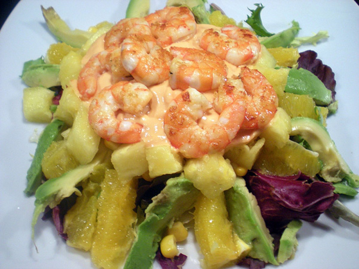 Ensalada tropical. paso a paso. AnteriorSiguiente PlatoFácil40 min294 Kcal Enviar esta receta a un amigo Imprimir esta página Preguntar al autor Publicar la foto de esta receta Ingredientes 4 Mezcla variada de lechugas Aguacate Naranja Cebolleta Maíz Piña Langostinos Aceite de oliva virgen extra Sal Salsa rosa Costo estimado: 5.92Euros€ (1.48€/porción)