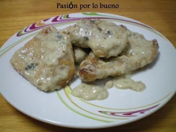 2ºEn una pota deshacemos el queso azul junto con el vino blanco, lo ponemos a fuego suave para que no se agarre al fondo y vamos removiendo de vez en cuando. Añadimos la nata y lo dejamos hervir un poco para que espese, no hace falta que hierva mucho tiempo. Añadimos la pimienta negra y removemos, apagamos el fuego y vamos añadiendo los filetes de pollo a capas intentanto cubrirlos todos con la salsa.