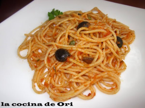 Espaguetis a la siciliana PlatoFácil30 min1137 Kcal Enviar esta receta a un amigo Imprimir esta página Preguntar al autor Publicar la foto de esta receta Ingredientes 3 500 g de espaguetis 10 anchoas en aceite de oliva virgen extra 10 aceitunas negras partidas por la mitad un puñadito de alcaparras 250 g de tomate natural triturado 3 dientes de ajo sal pimienta guindilla perejil orégano aceite de oliva virgen extra Costo estimado: 4.18Euros€ (1.39€/porción)