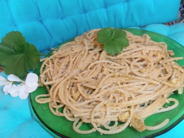 Espaguetis al pesto en el microondas PlatoFácil30 min Enviar esta receta a un amigo Imprimir esta página Preguntar al autor Publicar la foto de esta receta Ingredientes 4 225grm de espaquetis 1litro de agua hirviendo para la salsa: 75grm de nueces o piñones 50grm de albahaca 1 ajo 5 cucharadas de aceite