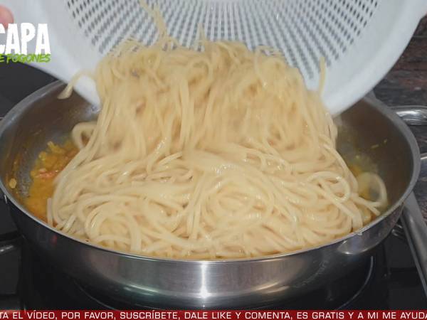 Una vez cocidos los espaguetis los escurrimos y los añadimos a la cazuela. Removemos bien para que los espaguetis se impregnen bien con la salsa y ya estarían listos.