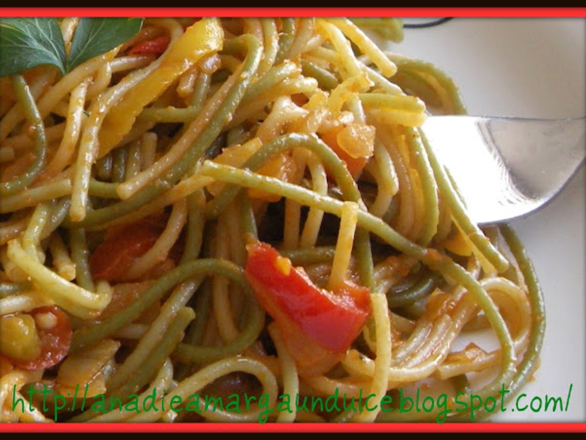 Espaguetis con tomate, cebolla y pimientos PlatoFácil35 min520 Kcal Enviar esta receta a un amigo Imprimir esta página Preguntar al autor Publicar la foto de esta receta Ingredientes 3 150 gr de pimientos verdes 150 gr de pimientos rojos 300 gr de cebolla 50 gr de aceite 180 gr de tomate sofrito Sal y pimienta 800 cc de agua 250 gr de espaguetis Sal Costo estimado: 10.55Euros€ (3.52€/porción)