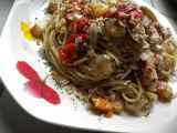 Espaguetis de mar al ajillo. el desconcertante mundo de las algas. AnteriorSiguiente PlatoFácil30 min Enviar esta receta a un amigo Imprimir esta página Preguntar al autor Publicar la foto de esta receta Ingredientes 1 dos ajitos una lata de espaguetis de mar, (algas) pimentón, pimienta. aceite de oliva gambitas peladas unos pedacitos de pimiento rojo una cucharadita de vinagre.