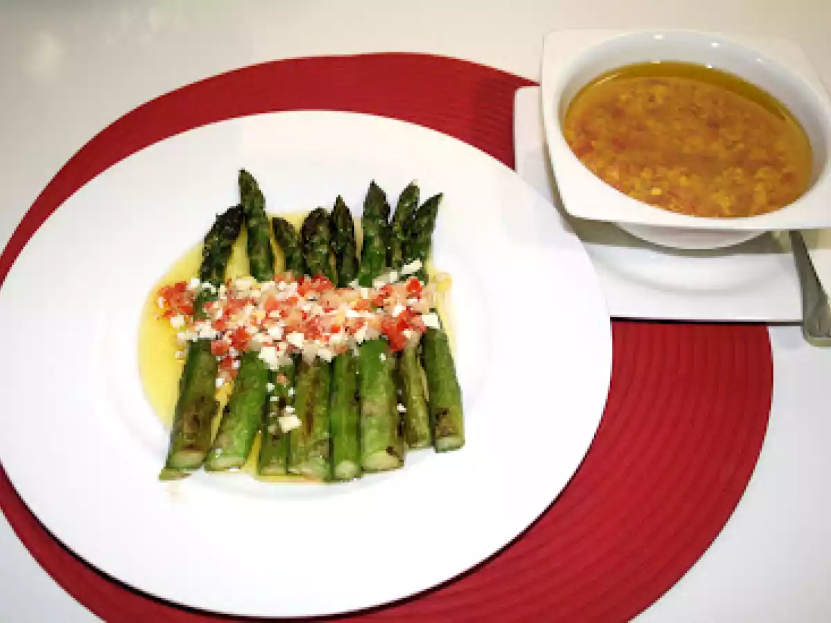 Espárragos trigueros con vinagreta (concurso cocina light) PlatoMedio50 min634 Kcal Enviar esta receta a un amigo Imprimir esta página Preguntar al autor Publicar la foto de esta receta Ingredientes 4 Espárragos trigueros 1/4 pimiento rojo 1/2 cebolleta fresca 1 huevo duro 20 cucharadas de Aceite de oliva 4 cucharadas de Vinagre de Jerez Sal y pimienta