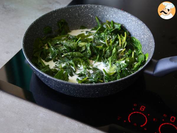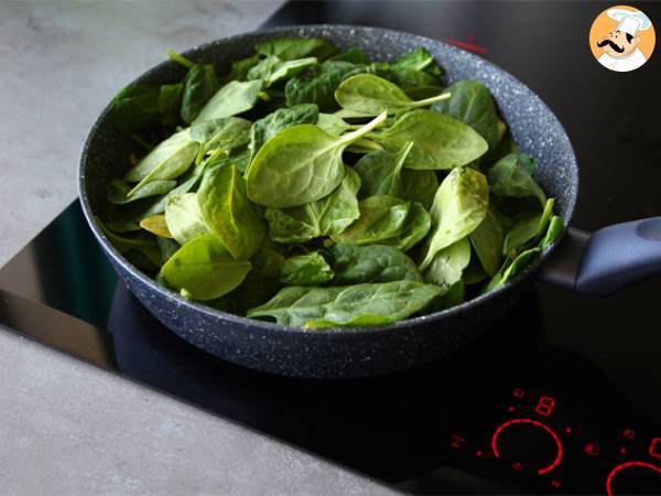 En una sartén, dora el ajo picado con la mantequilla. Añade las espinacas lavadas y escurridas. Pochar.
