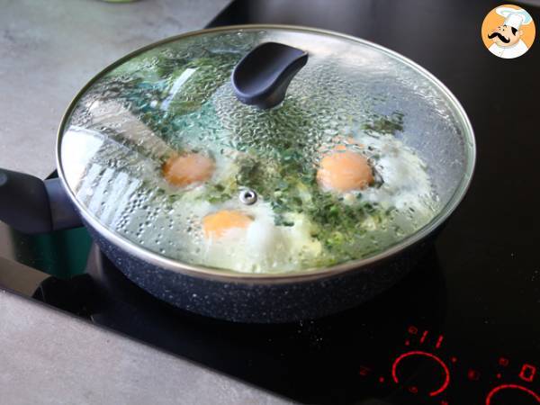 Cuando la nata espese, añadimos los huevos sobre las espinacas, separados unos de otros. Cubre con la tapa y deja cocinar algunos minutos.