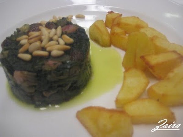 Espinacas salteadas con pasas y piñones y patatas española PlatoFácil50 min Enviar esta receta a un amigo Imprimir esta página Preguntar al autor Publicar la foto de esta receta Ingredientes 6 ESPINACAS SALTEADAS CON PASAS Y PIÑONES 800 gr. de espinacas congeladas 1 cebolla 150 gr. de bacon ahumado o de jamón york 75 gr. de piñones 75 gr. de pasas previamente remojadas aceite de oliva sal y pimienta PATATAS FRITAS ESPAÑOLA Patatas aceite Sal Costo estimado: 10.53Euros€ (1.75€/porción)
