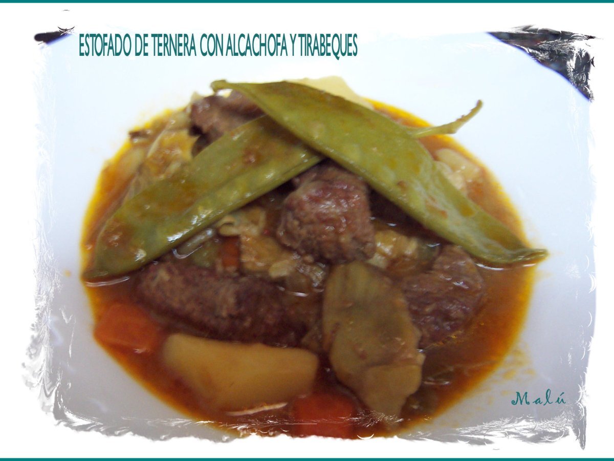 Estofado de ternera con alcachofas y tirabeques PlatoMedio1 h 25 m Enviar esta receta a un amigo Imprimir esta página Preguntar al autor Publicar la foto de esta receta Ingredientes 1 300 grs. de ternera para guisar a tacos 1 cebolla 1 puerro 1 diente de ajo 1 zanahoria 2 alcachofas 3 patatas 8 tirabeques Pimentón dulce ( 1 cucharada ) 4 bolitas de pimienta negra 2 clavos de olor 1 hoja de laurel Harina Sal Aceite de oliva Agua