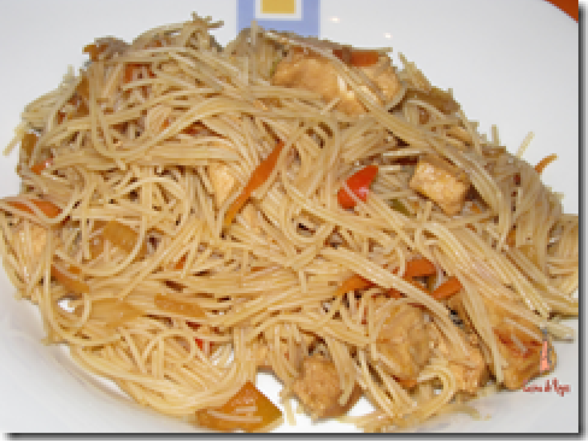 Fideos chinos con verduras y pollo PlatoFácil30 min800 Kcal Enviar esta receta a un amigo Imprimir esta página Preguntar al autor Publicar la foto de esta receta Ingredientes 1 1 paquete fideos chinos 2 pechugas de pollo 1 cebolla 1 zanahoria rallada Salsa de soja Puerro Pimiento Vino blanco Costo estimado: 4.14Euros€ (4.14€/porción)