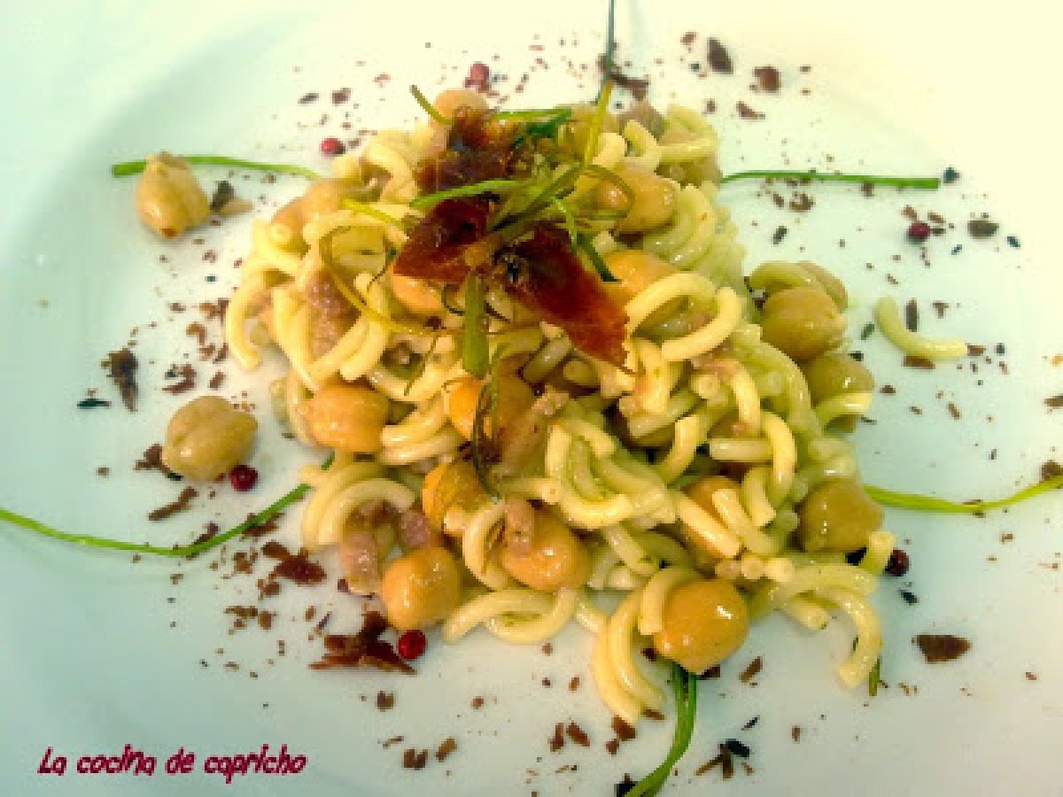 Fideos con garbanzos PlatoFácil25 min900 Kcal Enviar esta receta a un amigo Imprimir esta página Preguntar al autor Publicar la foto de esta receta Ingredientes 2 250 g de fideos ( tipo perla o de fideuá) 250 g de garbanzos cocidos 100 g de panceta o bacón 1 dl de vino blanco 1 diente de ajo 1/2 l de caldo de carne 1 rama de perejil 1 c.c de harina para espesar un poco Sal y pimienta Queso rallado para acompañar Costo estimado: 2.85Euros€ (1.42€/porción)