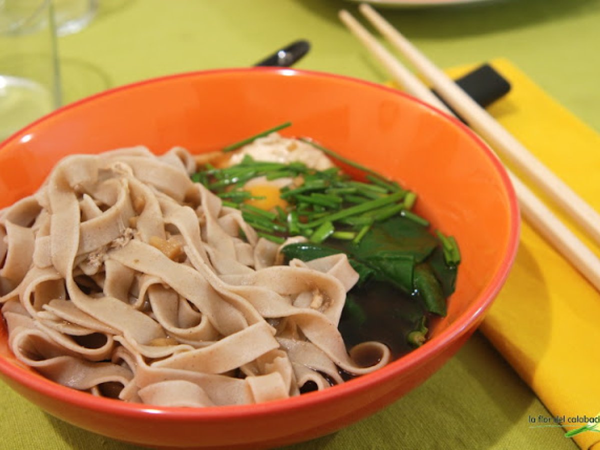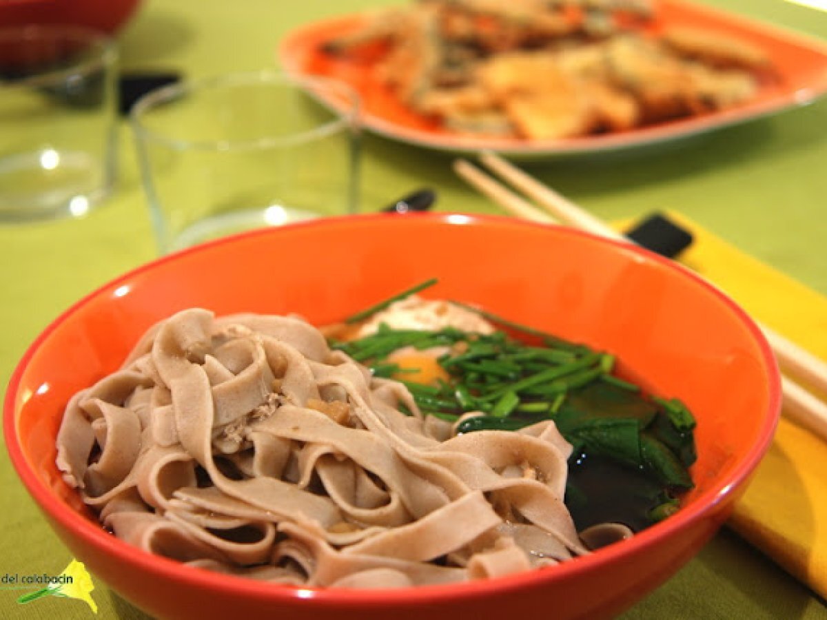 Fideos de alforfón caseros "para ver la luna" y tempura vota ahora AnteriorSiguiente PlatoFácil35 min Enviar esta receta a un amigo Imprimir esta página Preguntar al autor Publicar la foto de esta receta Ingredientes 1 120 gr de harina integral de alforfón ecológico 30 gr de harina blanca de trigo ecológico 50 ml de agua una pizca de sal 1/2 litro de caldo de verduras 1 trozo de jengibre fresco de 1 cm más 1 cucharada sopera de salsa de soja japonesa 1/2 cucharada sopera de mirin 75 gr de espinacas frescas troceadas 2 huevos cebollino fresco