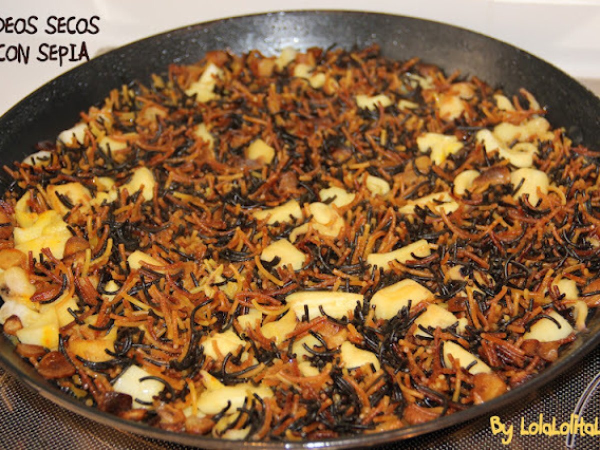 Fideos secos con sepia PlatoMedio1 h 10 m1438 Kcal Enviar esta receta a un amigo Imprimir esta página Preguntar al autor Publicar la foto de esta receta Una fideuá distinta Ingredientes 5 1,5 l de caldo de pescado 1 cabeza de ajos 1 sepia grande 1//2 kg de fideos (yo nº 1) Aceite sal