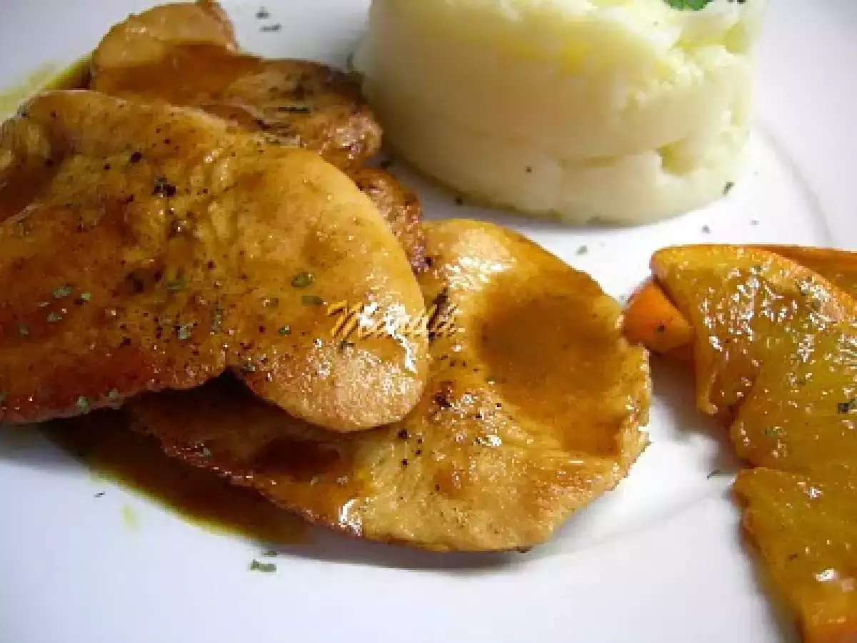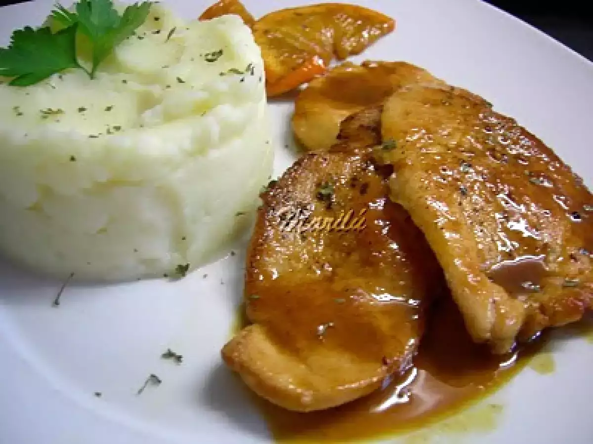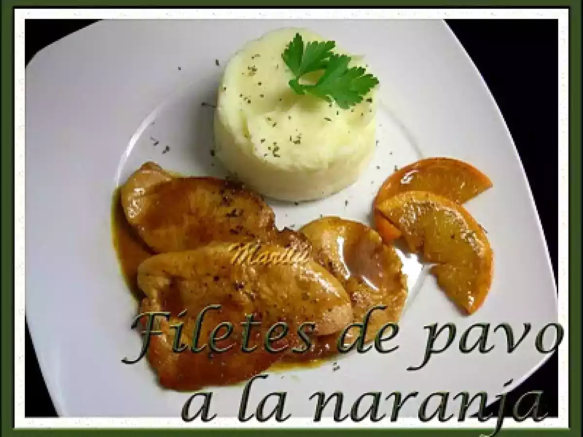 Filetes de pavo a la naranja AnteriorSiguiente PlatoFácil50 min184 Kcal Enviar esta receta a un amigo Imprimir esta página Preguntar al autor Publicar la foto de esta receta Ingredientes 2 filetes de pavo una cucharada de mantequilla sal pimienta el zumo de dos naranjas pizca de canela (opcional) 1/2 vaso de caldo de pollo Costo estimado: 1.63Euros€ (0.81€/porción)