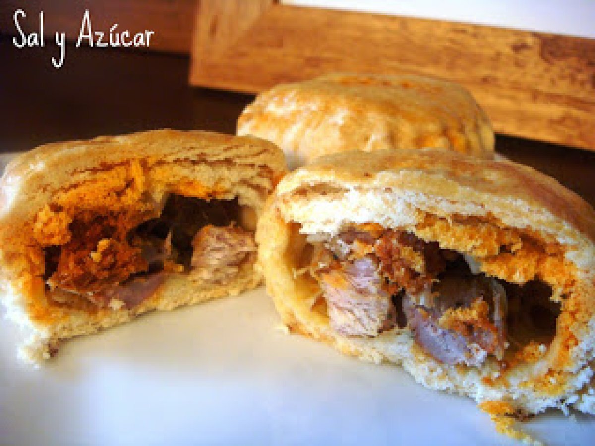 - Ponerla en el molde y rellenarla con trocitos de carne, de tocino y de sobrasada.Hacer otra bolita, alisarla y tapar.