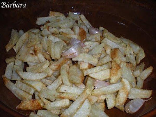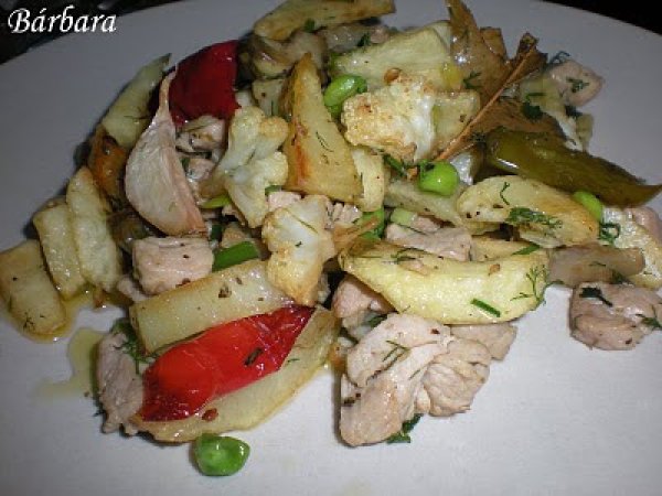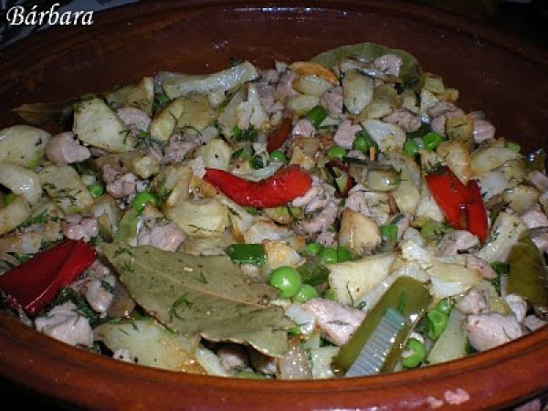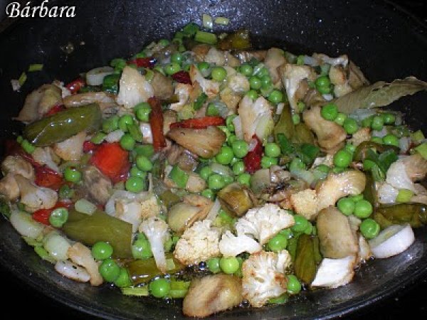 Frito mallorquin,,,,,,sin frito AnteriorSiguiente PlatoFácil30 min Enviar esta receta a un amigo Imprimir esta página Preguntar al autor Publicar la foto de esta receta Ingredientes 2 300 g de solomillo de cerdo troceado pequeño 5 patatas hermosas 1 manojo de cebolletas tiernas (troceado pequeño hasta lo verde, que sea bueno) 1 pimiento rojo troceado 6 ajos hermosos 3 hojas de laurel 2 alcachofas (troceadas pequeñas) 3 ramitos de coliflor (troceada pequeña) 2 puñados de guisantes congelados (que antes los he hervido un poco) 1 manojito de hierbas: hinojo, hierbabuena y oregano, todo bien picadito. Se le suele poner un poco de guindilla, aunque yo no se lo he puesto sal y pimienta aceite de oliva para freir.