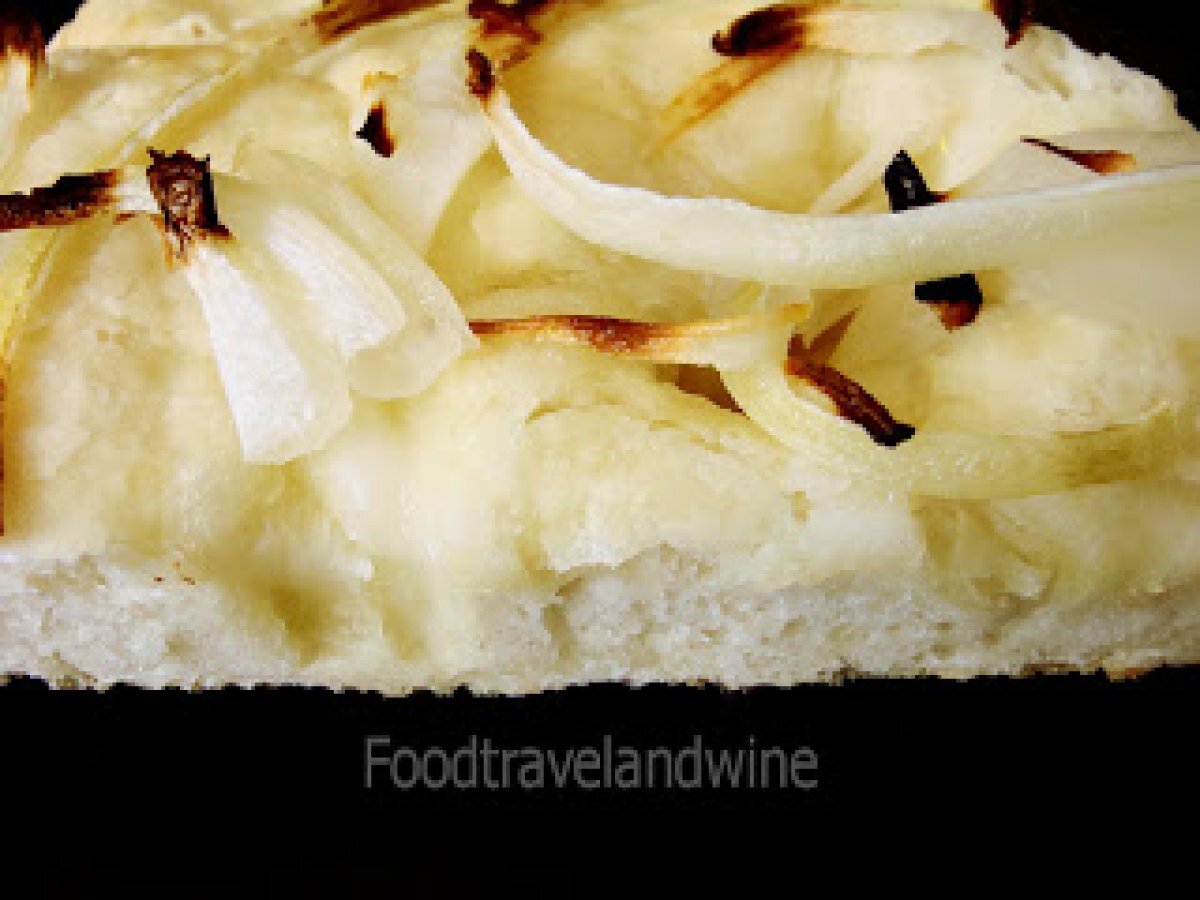 - Precaliente el horno a 435F, y poner un recipiente con agua para crear un ambiente húmedo. Distribuya la cebolla en rodajas en la parte superior de la fugassa, y espolvorear con sal y aceite de oliva. Déjalo cocer durante unos 20-30 minutos, o hasta que estén doradas. Sirva a temperatura ambiente.