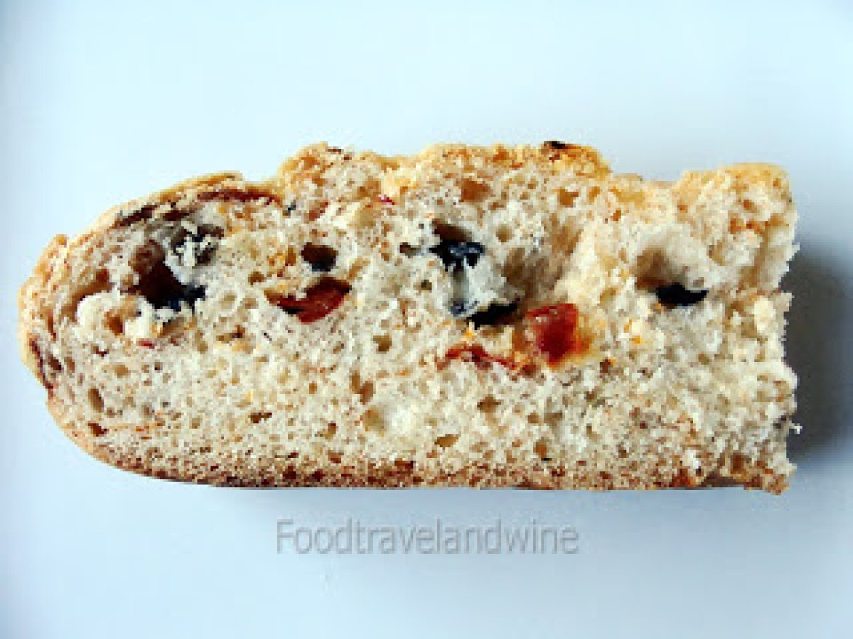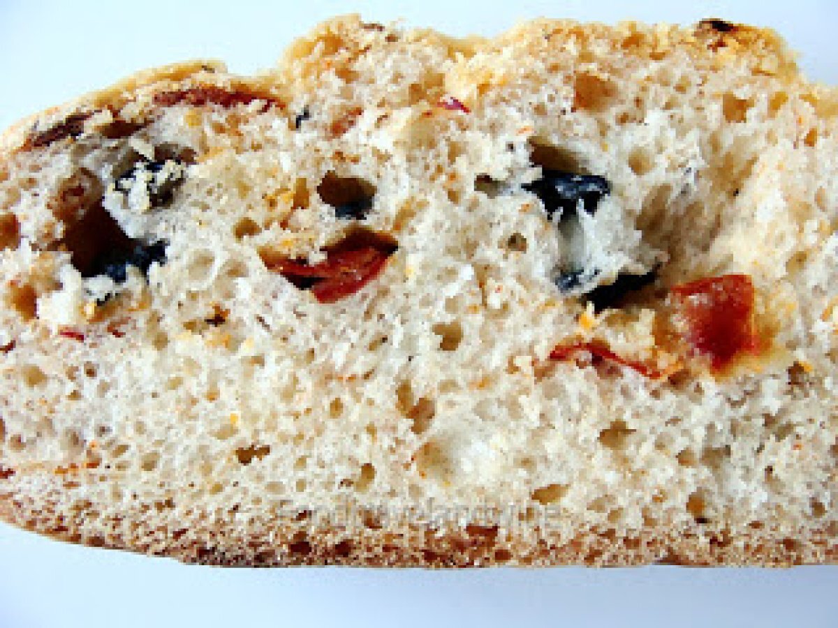 - Mezcle 1 / 2 taza de agua tibia con el azúcar y la levadura seca. Ponga a un lado hasta que esté espumoso. En un tazón grande, mezcle la harina, la sal, el tomate y las aceitunas. Agregar la espuma de levadura, aceite de oliva, y el resto del agua hasta obtener una masa suave pero no pegajosa.
