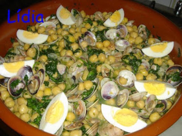 Garbanzos con espinacas y almejas PlatoFácil1 hora221 Kcal Enviar esta receta a un amigo Imprimir esta página Preguntar al autor Publicar la foto de esta receta Ingredientes 6 300 g de garbanzos cocidos 200 g de espinacas congeladas 500 g de almejas 2 huevos media cucharada de harina 1 vaso de vino blanco aceite sal y pimienta perejil