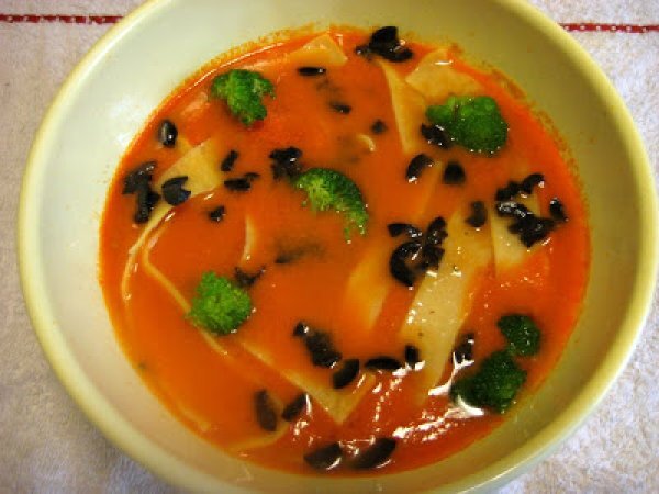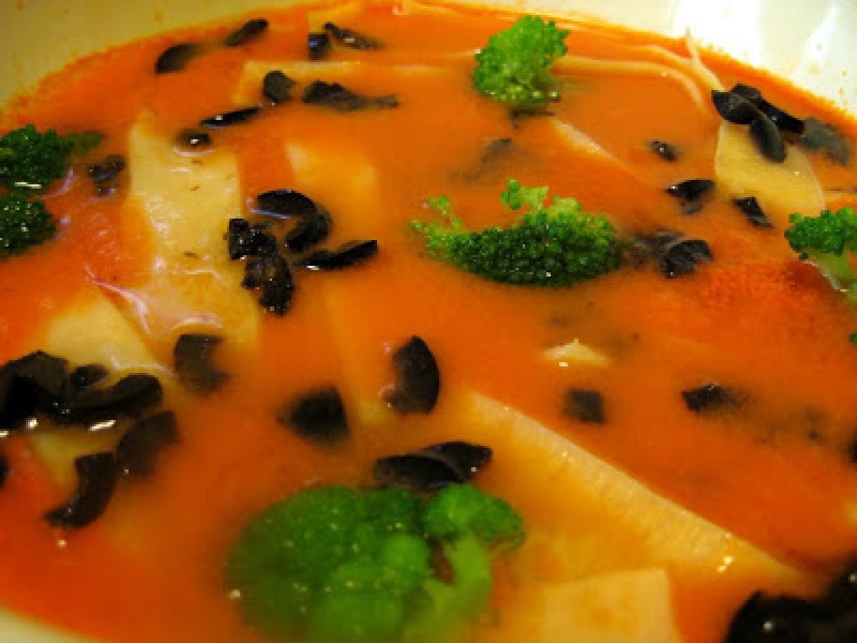 Gazpacho caliente con pasta y brocoli AnteriorSiguiente PlatoMedio45 min Enviar esta receta a un amigo Imprimir esta página Preguntar al autor Publicar la foto de esta receta Ingredientes 4 1 Kg. de Tomates Maduros 1/2 Pimiento Verde 1/2 Pepino 1 Diente de Ajo 1 dl. de Aceite de Oliva Virgen Extra Vinagre de Vino (al gusto) Cominos Sal Pan Duro 4 Láminas de Pasta de Lasaña 4 Ramilletes de Brocoli Aceitunas Negras