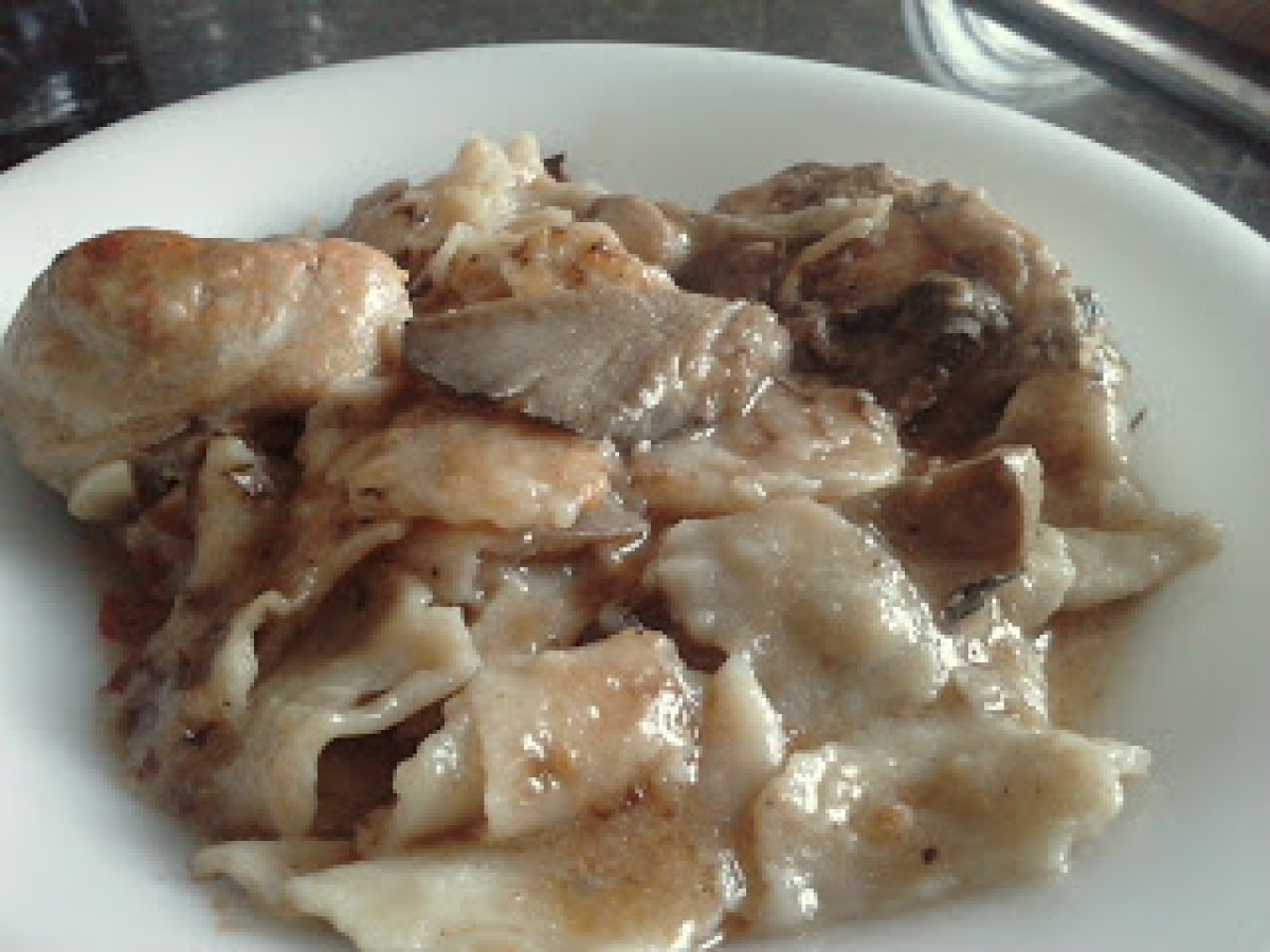 - Mientras se frie el pollo, pelamos el tomate y lo trituramos con una cucharada de azúcar. Una vez frito el pollo, añadimos el tomate dejandolo a fuego lento para que se vaya friendo; una vez se haya frito el tomate, añadimos un chorrito de vino blanco y dejándolo a fuego lento un par de minutos.