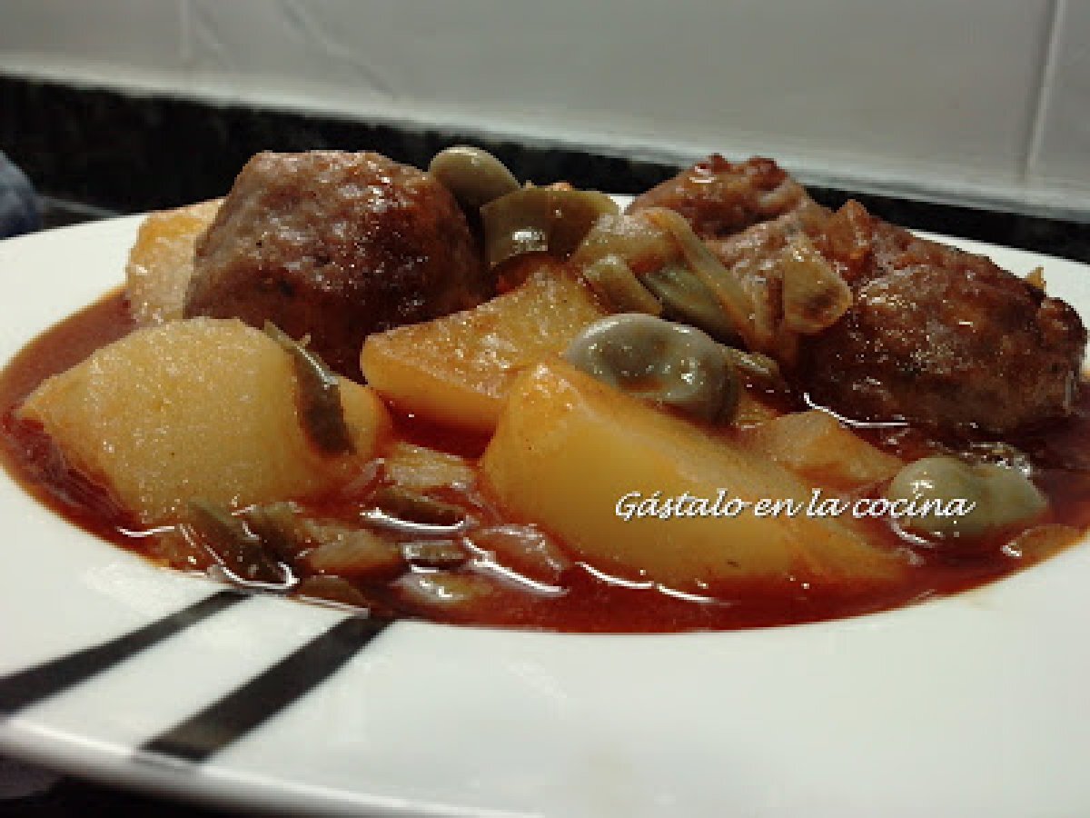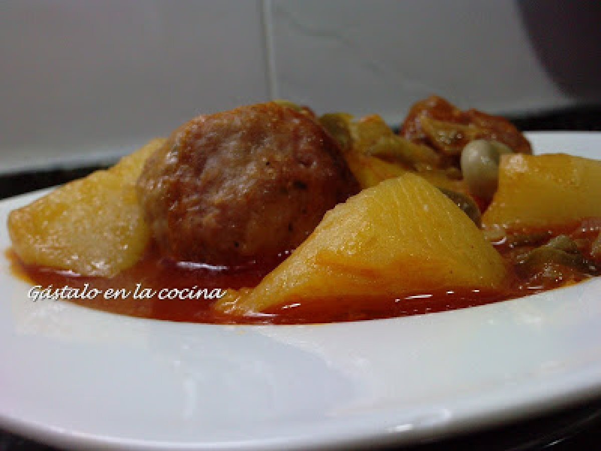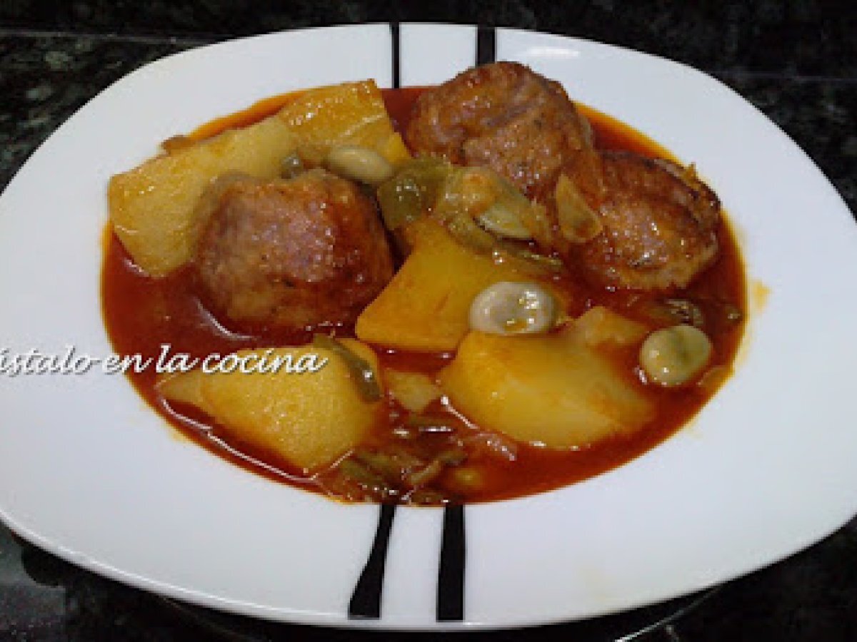 Guiso de pelotas murciano (a mi manera) AnteriorSiguiente PlatoFácil30 min601 Kcal Enviar esta receta a un amigo Imprimir esta página Preguntar al autor Publicar la foto de esta receta Ingredientes 3 6 albóndigas de pavo-pollo Harina para rebozar las pelotas 4 patatas no muy grandes 1 pimiento verde 1 cebolla pequeña 1 tomate maduro 1 cucharadita de pimentón dulce 4 cucharadas de aceite de oliva Sal Pimienta negra Agua 2 dientes de ajo Habas (al gusto) Costo estimado: 27.9Euros€ (9.3€/porción)