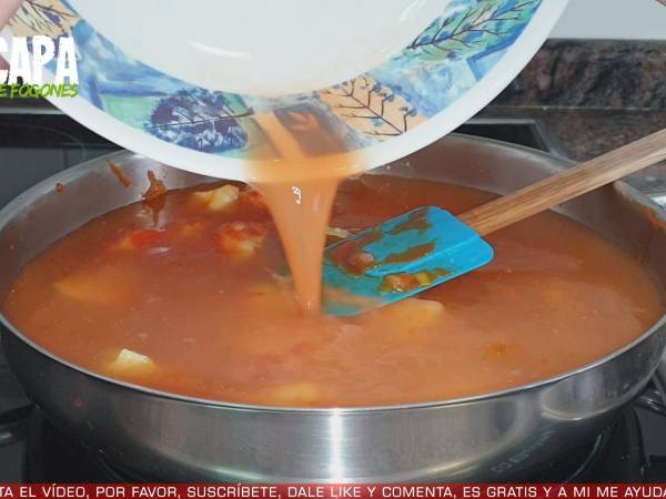 Después, añadimos la salsa de tomate, removemos bien, le ponemos una hoja de laurel y cubrimos con el caldo que habíamos preparado anteriormente.