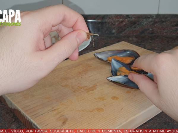 Mientras tanto, aquí tengo unos mejillones, a los que les voy a quitar las barbas que suelen tener.