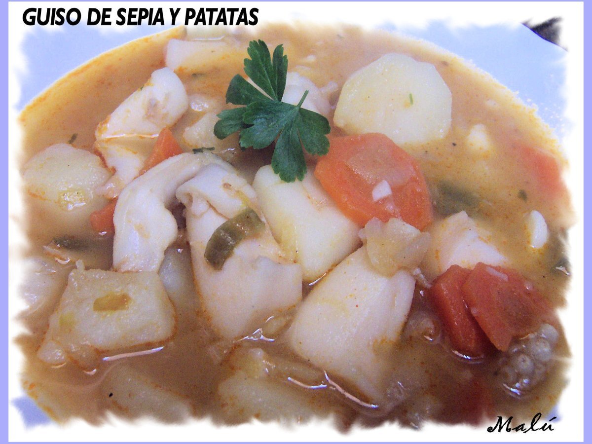 Guiso de sepia y patatas PlatoMedio40 min1817 Kcal Enviar esta receta a un amigo Imprimir esta página Preguntar al autor Publicar la foto de esta receta Ingredientes 1 900 grs. de sepia a trocitos 1 cebolla en brunoise Blanco de un puerro en brunoise 1 pimiento italiano en aros 1 zanahoria grande en rodajas 1 tomate maduro rallado 2 dientes de ajo picados 1 puñado de piñones 4 patatas gorditas, chascadas 1 cucharada de pimentón dulce c/s pimienta negra 1 tacita de vino blanco Aceite de oliva c/s sal 1 hoja de laurel Perejil Agua Costo estimado: 15.67Euros€ (15.67€/porción)