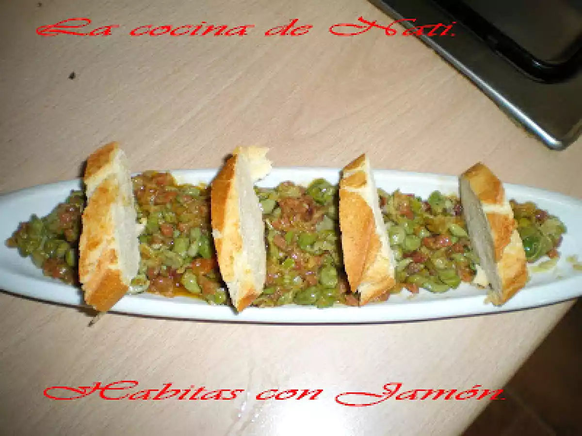 Habas con jamón. PlatoFácil35 min334 Kcal Enviar esta receta a un amigo Imprimir esta página Preguntar al autor Publicar la foto de esta receta Ingredientes 4 500 g. de habas. 2 cebollas tiernas. 1 ajo tierno. 1 tomate. 100 g. de jamón serrano. 4 cucharadas de aceite. Pimienta. Costo estimado: 4.59Euros€ (1.15€/porción)