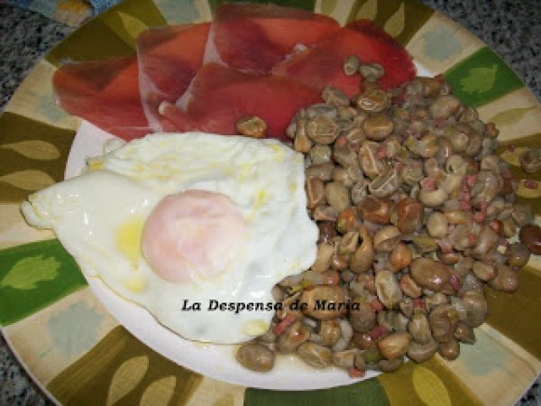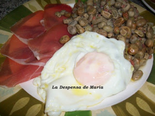 Habas con jamon y huevo frito AnteriorSiguiente PlatoFácil30 min443 Kcal Enviar esta receta a un amigo Imprimir esta página Preguntar al autor Publicar la foto de esta receta Ingredientes 4 1 kg de habitas baby, 250 g de pizcas de jamón, 1 cebolletas grande, sal al gusto y aceite de oliva virgen. Costo estimado: 9.69Euros€ (2.42€/porción)